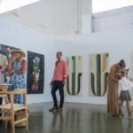 The artist Jill Mulleady drew on her youthful experience of meeting Diego Maradona. Obrist enthuses, “She almost resurrects Maradona through a hologram!” English painter Rose Wylie collaborated with England footballer Lotte Wubben-Moy, who loves drawing and provided images for Wylie to reimagine. Mexican sculptor and fashion designer Bárbara Sánchez-Kane collaborated with cult Mexican keeper Jorge Campos.