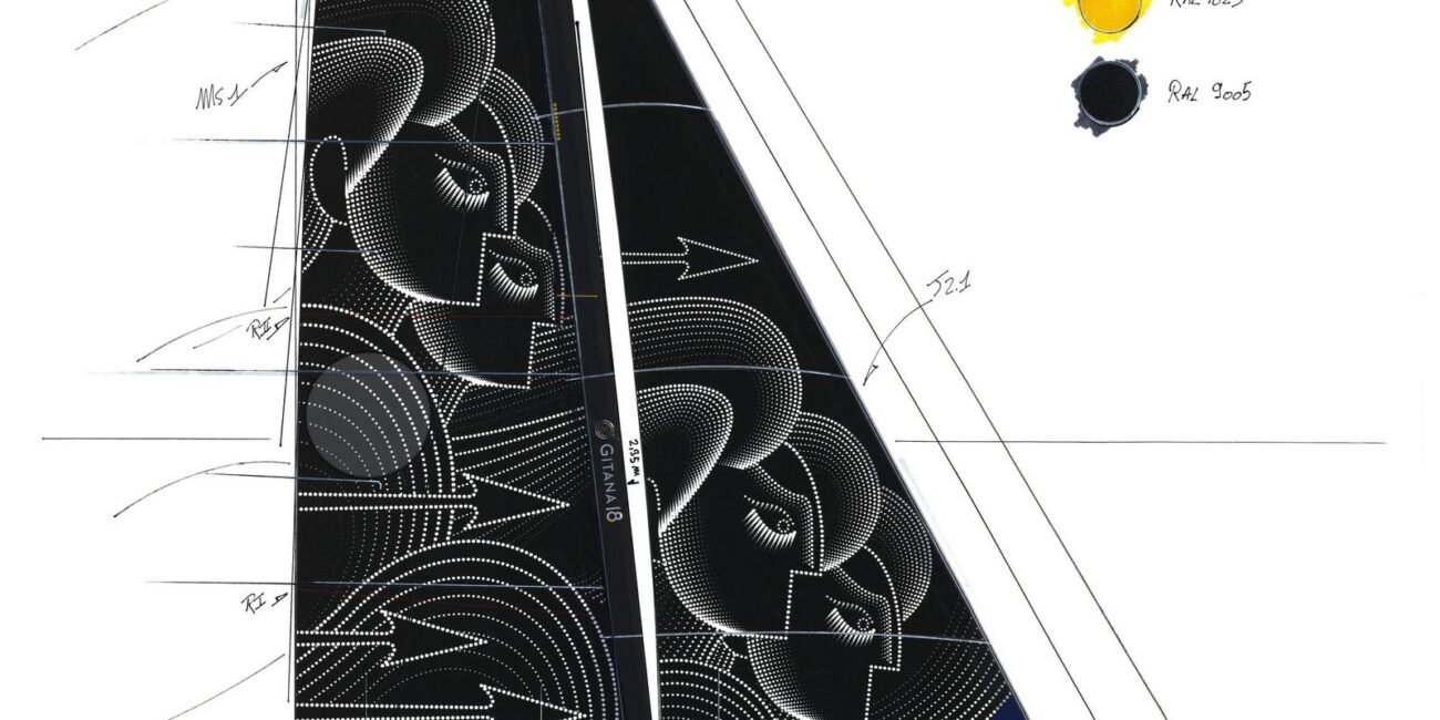Eight years ago in Paris I stopped into the Palais de Tokyo modern and contemporary art building to view new artwork revealed for the Gitana 17—the then latest Maxi Edmond de Rothschild racing trimaran. There, I spoke with Los Angeles based artist Cleon Paterson who had created striking imagery for the sail and hull. I later wrote about this art in a piece related to modern sailing.