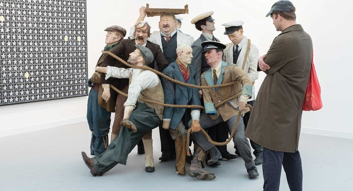 A two-part installation focusing on histories of labour, at its heart is a cluster of mannequins—once in use at the National Motor Museum, Beaulieu in Hampshire—bound together with rope. Formerly employed in dioramas to illustrate industrial history, these working people are now severed from their original purpose—one of numerous metaphors in Arden’s work. And they are quite literally severed: many have limbs or even a head missing. The work on the wall behind them is a painting of a Daily Departmental Accident Record from a Hollywood film studio, a table in which injuries to different departments of a film production are catalogued with gold discs representing time lost to injury. The linking thread is the idea that sometimes bloodied labour lies behind spectacle.