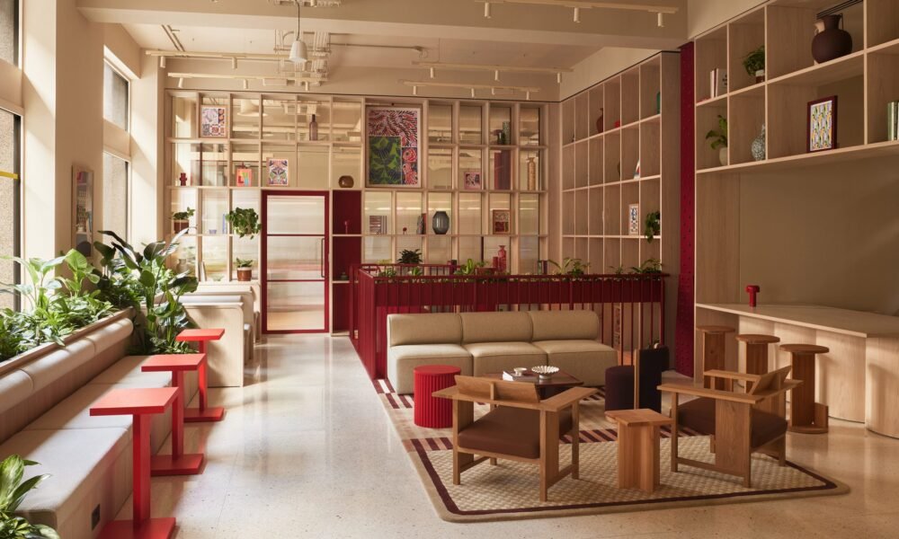 A raspberry-red spiral staircase connects communal areas at this office development in London, designed by local studio SODA to reference the art deco style of...